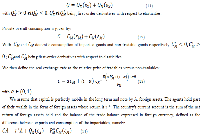 The economy is in flexible exchange rates and the nominal exchange rate is denoted E. This hypothesis may seem at first sight astonishing, especially since the countries in our sample are in fixed exchange rate. However, we are thinking here in a long-term perspective and also consider in the econometric part a long-term relationship. Of course, the exchange rate can be fixed in the short and medium term, but in the long run to maintain parity countries must have a sufficient amount of foreign exchange, which is not the case for the majority of countries in the world including those in our sample. Since the nominal exchange rate will eventually adjust, we assume here that it is flexible.