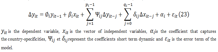 As such, the use of traditional estimation techniques (Ordinary Square Least, fixed effects, and random effects) leads to non-convergent estimators. To overcome this endogeneity problem, the authors use the generalized moment method (GMM). But this method has some disadvantages, in particular, the homogeneity of the coefficients, except for the constant which captures the specific effects. This homogeneity implies that the effect of a variable cannot differ from one country to another. Indeed, the GMM approach ignores the unit root and cointegration properties of the series, it is difficult to clearly state that the results provide long-term effects or fallacious results. In addition, in a dynamic panel, the homogeneity of the coefficient of the delayed endogenous variable can lead to biases. The delayed variable is, therefore, an explanatory variable.