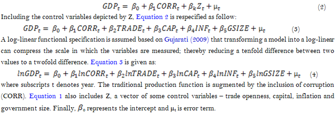 Several macroeconomic variables influence economic growth of a country and including most of these variables into a model enhances its fitness. However, loading too many variables into a model may also decrease the degrees of freedom. This study adopts a model which utilizes one independent variable – corruption. The study uses a regression analysis to estimate the dependent variable given the predictive variables. Real GDP as a proxy for economic growth, denotes the dependent variable. The OLS regression model will be specified as: