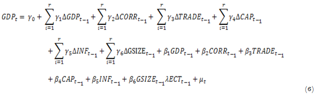 The possibility of a bidirectional relationship between corruption and economic growth presents a potential problem of endogeneity in empirical estimations. As a result, we employ the ARDL technique, which has the potency to correct simultaneity issues through the inclusion of an unrestricted number of lags for the regressed and regressors. The application of ARDL estimator is also informed by the fact that it is very efficient in studies adopting small or finite samples (Pesaran, Shin, & Smith, 2001). In applying the ARDL bounds test approach to cointegration to determine the long-run relationship between economic growth and the other variables we initially estimate Equation 4 with an ARDL specification of the form: