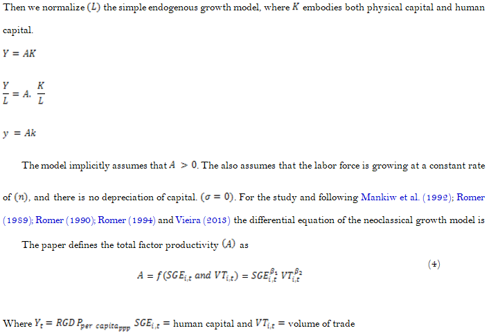 This paper contributes to the research of economic growth, that is, human capital and how it fosters economic growth following Lucas Jr (1988); Barro (1991); Mankiw, Romer, and Weil (1992).
