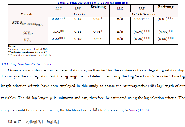 Levin, A., Lin, C.-F., & Chu, C.-S. J. (2002). Unit root tests in panel data: Asymptotic and finite-sample properties. Journal of Econometrics, 108(1), 1-24. Available at: https://doi.org/10.1016/S0304-4076(01)00098-7.