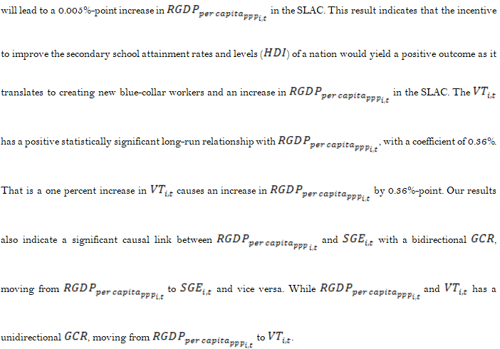 In conclusion, this paper adopted the Mankiw et al. (1992) technique and supports that education is imperative for economic growth and development for the SLAC. Despite this widespread belief that investment in education is a key determinant of economic growth and shortly will lead to economic development, the empirical estimations, especially focusing on low-income countries, are less than conclusive. Quiggin (2002); Devarajan, Swaroop, and Zou (1996); Benhabib and Spiegel (1994). This can be attributed to how schooling, investment, and successes are measured.
