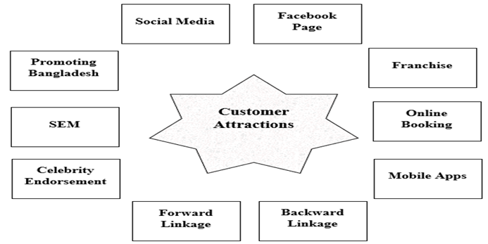For the purpose of the study, social media, user-friendly and interesting web page, brandings like franchising, online booking, mobile apps, establishing forward business relation (linkage with target customers) and backward business relation (linkage with suppliers & personnel), promoting Bangladesh’s tourism, launching Facebook page, search engine marketing (SEM), celebrity endorsement and evaluation site were used as predictor variables. Response regarding every explanatory variable was categorized into three as agree, neutral, and disagree.