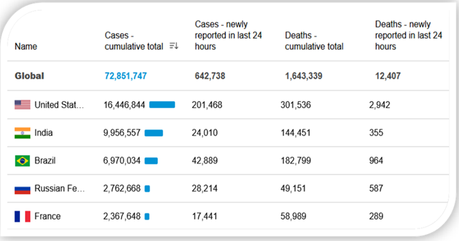 The Global COVID-19 pandemic has infected millions of the world's population at a shocking speed. Its emergence has halted and brought down economic activities across the globe due to the imposition on mobility to curtail the disease's spread. Over some decades, the world has not witnessed such an experience. However, it has a significant toll on various economies due to shocks emanating from deteriorating human and health conditions (World Bank, 2020). This pandemic is exceedingly a health crisis but social and economic crises due to the effects it has had on lives and economies at large. Moreover, the pandemic's impact would be heterogeneous from country to country, and it is likely to widen inequalities and poverty globally. This development would stall the progress made to achieve the Sustainable Development Goals, requiring much attention and urgent response (United Nations Development Programme, 2020). According to Sarkodie and Owusu (2020), the nexus of environment-health-economic impact on human lives and countries at large have become necessary due to the emergence of the COVID-19 pandemic. Since the global pandemic brought about the need to show much concern about the consequences surrounding the environment, health, and economy (Wang, Horby, Hayden, & Gao, 2020). As of December 18, 2020, the number of COVID-19 cases recorded worldwide stands at 72,851,747, and the number of deaths stands at 1,643,339, whereas the United States of America suffered most with a total number of 16,446,844 representing 22.58% of the total cases, and 301,536 deaths representing 18.35% of the total deaths in the world with India, Brazil, Russia, and France follow suit as the top five countries with the most cases in the world see Figure 1.