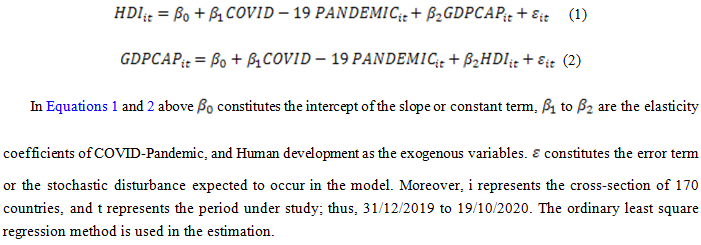 Due to the supply and demand side disruptions, the pandemic has caused the global economy to escalate into loss of jobs, loss of income, health, and education deterioration affecting human capital development (United Nations Development Programme, 2020). Moreover, causing an economic downturn sending the global economy into recession (World Bank, 2020). This study intends to quantify the impact of the pandemic on the global economy and poverty alleviation. Hence, the study constructs the model below for its econometric and empirical analysis;