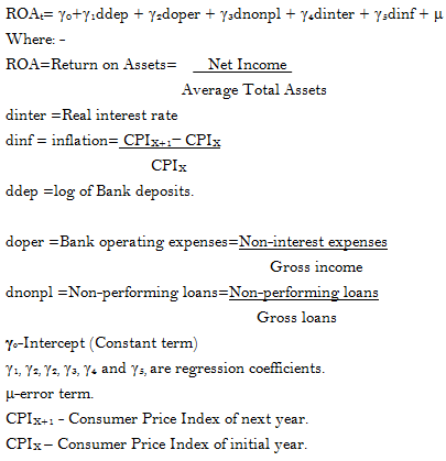 The noted ambiguity results obtained by different researchers necessitates for further research to be conducted especially in Tanzania where the performance of banking sector was not good in 2017 (Bank of Tanzania, 2018). This study was expected to provide a clear picture about the relationship that exists between Profitability (ROA), bank deposits, bank operating expenses, non-performing loans, real interest rates and inflation.