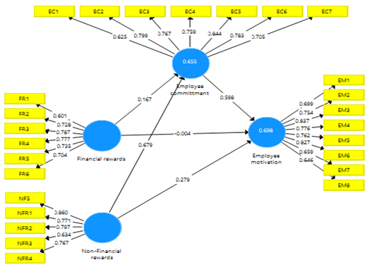 After assessment of measurement model through PLS algorithm, model was assessed through structural equation modeling using bootstrapping to test the hypothesis. Results of hypothesis of current study are depicted in Table 4. and Figure 3. Out of 7 hypothesis (5 direct hypothesis and 2 indirect hypothesis) one direct hypothesis was not accepted which was predicted as “financial rewards has positive significant influence on employee commitment” current study found positive but insignificant results (β=0.044, t value = 0.46, p value = 0.46) so based on p value this hypothesis was considered as rejected. While applying mediation of employee commitment between relationship of financial rewards with employee motivation, current study found significant results (β= 0.077, t value = 2.196, p value =0.028) and considered as accepted. Beside this employee commitment also found as significant mediator between relationship of non-financial rewards with employee motivation (β=0.395, t value =7.966, p value <=0.000). Rest of the hypothesis were found according as hypothesized based on evidences in literature.