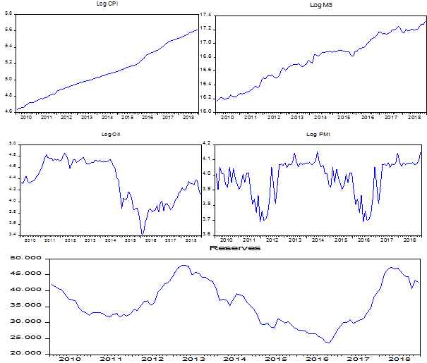 To analyse the dynamic impact of the broader money supply (M3) on economic growth (proxied by Purchasing Manager Index) in Nigeria, the study adopted monthly series from 2010M1-2018M4.The time series data used for the study were directly sourced from the Central Bank of Nigeria’s statistics database. Purchasing Manager Index is the dependent coefficient and a proxy for GDP while Broad Money Supply (M3), Reserves (RES), Consumer Price Index (CPI) and Oil Price (Oil) are the predictor’s variables. The source of the data and the variables are summarized as follows: