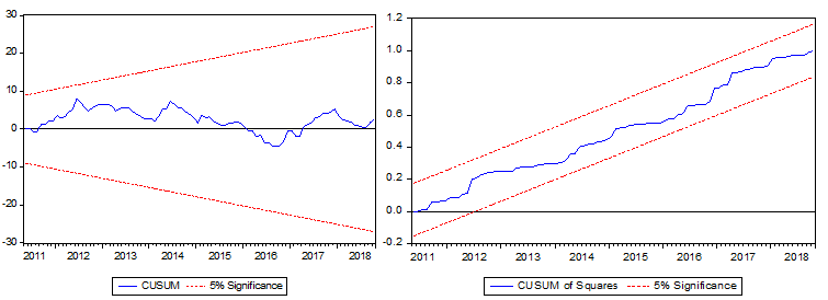 In accordance with Brown, Durbin, and Evans (1975) a stability verification check should be carried out on any model to avoid spurious results. They recommended both the cumulative sum (CUSUM) and cumulative sum of square (CUSUMSQ) on recursive regression residual. However, the plots must fall within 5% critical bounds of significance to accept the stability of the model. Based on the first set of n observations which is updated recursively and plotted against the breakpoints, the test is based on the cumulative sum of recursive residual, and CUSUMSQ also follows the same procedure.
