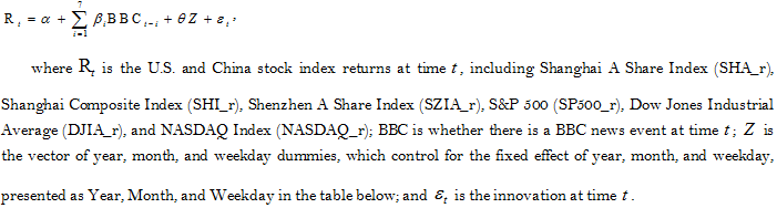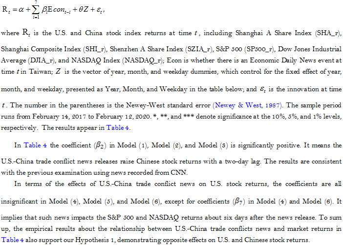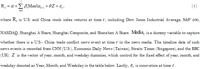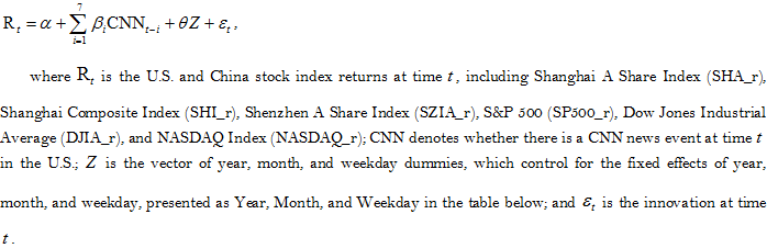 In order to understand the possible relationship of U.S.-China trade conflict news events on U.S. and Chinese stock returns, we use the following regression model to examine the time point of the events on CNN News: