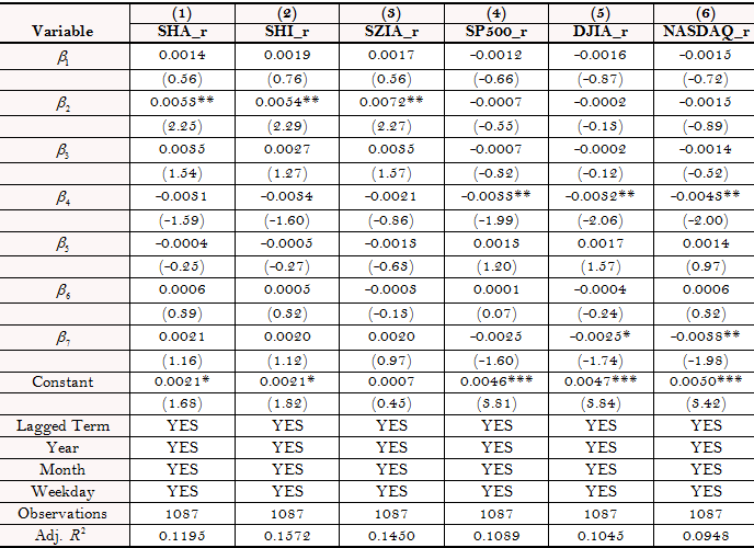 The number in the parentheses is the Newey-West standard error (Newey & West, 1987). The sample period runs from February 14, 2017 to February 12, 2020. *, **, and *** denote significance at the 10%, 5%, and 1% levels, respectively. The results appear in Table 6.