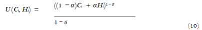 Equation 10 is the household’s in-period utility function, where α ∈ (0, 1) is the utility weight on health. (1 − α) is the utility weight on consumption. σ> 1 is the coefficient of risk averse.