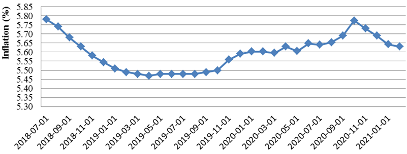 The rising of price level is commonly known as inflation. Fluctuations in price level may also be the reason behind the rising consumer price index (CPI) which creates hazards at the national level by the rising inflation. Figure 3 shows the present scenario of the inflation rate where the inflation rate is measured by CPI. The monthly basis inflation rate in Figure 3 is presented from 2018M07 to 2021M02. Inflation presented in 2018M07 was 5.78%. The decreasing rate in 2018M12 was 5.54% that depicts a decreasing trend beginning from the starting points. Early in 2019M01, it changed to 5.51% whereas in the mid of 2019M07 it was 5.48%, at last in this year inflation was 5.59% ; this is the evidence of rising inflation rate from a downturn position. At the beginning of 2020M01, it was 5.60%, 5.65% in middle and last period of 2020 it was present at 5.69%. The result indicates a rising trend of inflation rate but it is a positive sign for an economy that in the early 2021M01 inflation rate reduced to 5.64%. It is largely expected that a country should have a lower level of inflation.