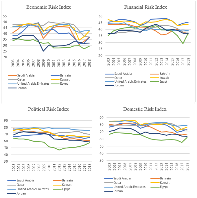 Figure 1 demonstrates the domestic risk and the country-specific sub-indices scores for the examined period of 2003-2018. As shown in Figure 1, Egypt has the least stable environment relative to other countries. Overall, Figure 1 shows that domestic risk has a negative trend, and countries experienced domestic instability between 2003-2018.