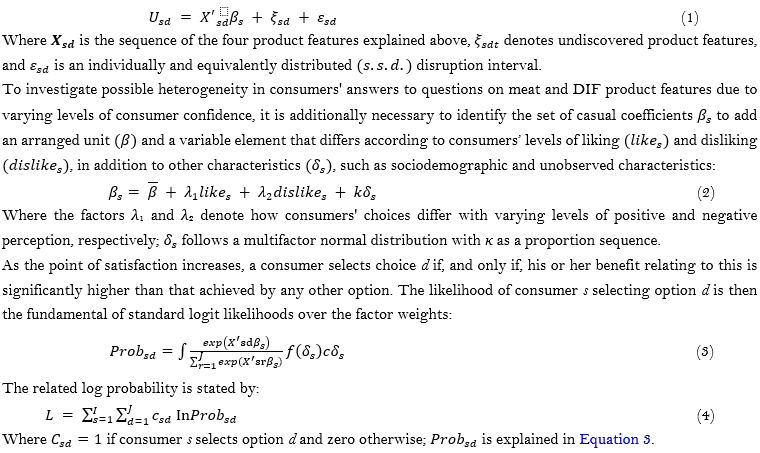 A mixed logit model was used to examine data from the selection assessment, concerning the number of objectives. A mixed logit model permits for heterogeneity in perceptions that are separated into recognized characteristics (Hole & Kolstad, 2011). One interesting quality of the mixed logit model is that it requires but does not suppose the separation of unrelated choices; consequently, this is considered a more reasonable model design than the standard logit model (Abbas et al., 2021; Yu, 2010). Moreover, it has been shown that certain discrete choice random utility models are feasibly estimated by a properly identified mixed logit model (Abbas, Zhao, Gong, Jiang, & Faiz, 2022; Kertesz, 2017). Consumers are expected to select a feature collection of meat and DIF products based on their budget. The satisfaction of consumer s selecting product d among J choices of meat and DIF products is represented as: