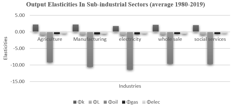 Based on Christensen, Jorgenson, and Lau (1973), the translog production function was estimated using the inputs of capital, labor, oil, gas, and electricity for nine major industries of Pakistan from 1980 to 2018, and the results are shown in Table 1. For the analysis, the trans-log production function was estimated using panel data. As it is long panel data, the panel unit root test was applied to all variables to check for stationarity; all variables were found to be stationary at first difference. To estimate the translog production model, Stata software was used after taking the log of all variables. All the variables were first normalized by their mean. Due to the long panel data, there were problems of cross-sectional dependence, which was solved by estimating the fixed model through Driscoll-Kraay standard errors. The model passed all panel data diagnostic checks, including the LM test of independence, modified test for group-wise heteroscedasticity, and Wooldridge test for autocorrelation. All the results of the production function estimates are provided in the table below.