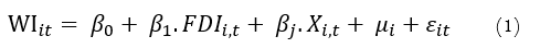According to the theory of  Te Velde (2003), FDI can affect the supply and demand of skills, leading to an increase in the wages of skilled and/or unskilled labor, thus having a positive or negative impact on wage inequality. Based on Te Velde’s (2003) theoretical model of skills supply and demand, as well as the empirical research of Taylor and Driffield (2005), the author estimates the impact of FDI on wage inequality in Vietnam using the following empirical model: