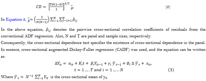 Long-run parameters are assumed to be most likely to exhibit cointegration relationships with a set of I(1) variables (Asteriou, 2009). Despite this, it was anticipated that the macroeconomic variables included in the model would exhibit unit root and thus non-stationarity (Nelson & Plosser, 1982). Therefore, it was imperative to ascertain the variables' stationarity status to confirm their order of integration. Therefore, the unit root tests of Kao and Chiang (2001), Levin, Lin, and Chu (2002), Im, Pesaran, and Shin’s (2003) Augmented Dickey-Fuller (ADF), Fischer Chi-square (Maddala & Wu, 1999), and Philips-Perron (PP) Fischer Chi-square (Maddala & Wu, 1999) tests were employed. To avoid fluctuation in the data series, we transformed the data (variables) into their natural logarithm to save the regression results from spurious coefficients. Testing for cross-sectional dependence revealed the existence of contemporaneous correlation across the sampled countries. To be able to perform the cross-sectional dependence test, Pesaran's CD test approach was utilized. Pesaran (2004) proposed the below equation for the CD statistic: