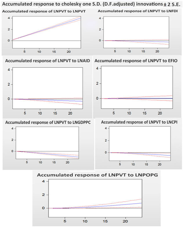 LNPVT=Poverty alleviation, LNFDI=Foreign direct investment, LNAID=Foreign aid, LNY= Gross domestic product per capita, LNCPI=Consumer price index, LNPOPG=Population growth, EFIO=Economic freedom index.