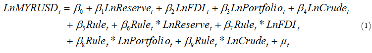 Given the presence of a dummy variable, the estimated coefficients of in Equation 1 measure the average impact of the reserve, FDI, portfolio, and crude oil price on MYR in the pre-FEA rules period, respectively. However, those variables might impact MYR differently under the new FEA rules. An interaction term between dummy variables and explanatory variables was included in the model. Accordingly, the estimated coefficients for the interaction term were used to denote the reserve, FDI, portfolio, and crude oil price effects on MYR in the post-FEA rules period. The inclusion of the interaction term aimed to provide a clearer picture of the effect of those variables on MYR before and after the new rule, thereby providing the correct model specification. In other words, interaction terms were included to provide insight into the mitigating role of the FEA rules.