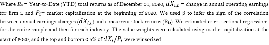 Figure 1 shows that the Energy & Utilities sector experienced the largest decline (-6.17%) in its earnings. The reason for this decline is likely that large oil companies faced a substantial change in aggregate demand for oil along with oil price shocks. Lockdowns were extensively enforced in the second quarter of 2020, which decreased oil consumption and, therefore, oil prices. Additionally, the Energy and Utilities sector experienced the largest negative value-weighted stock returns (-19.84%) during the sample period, supporting the argument that market forces incorporate earnings information into stock prices.
