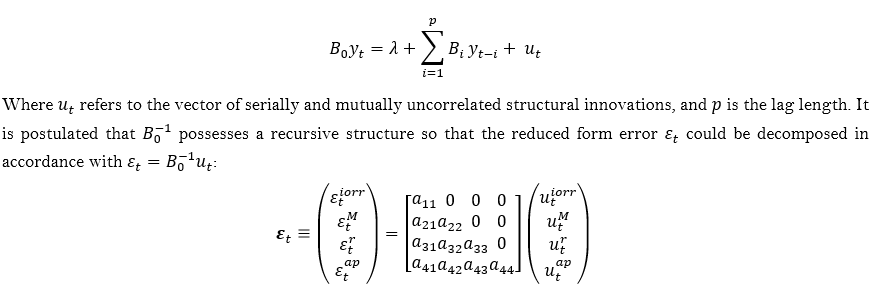 Following Sims (1980), a vector autoregression (VAR) model using U.S. monthly data from October 2008 to July 2019 is proposed as follows: