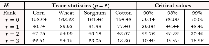Table 2. Johansen cointegration test results for each agricultural commodity price series with the interest rate on required reserve, money supply and real interest rate.
