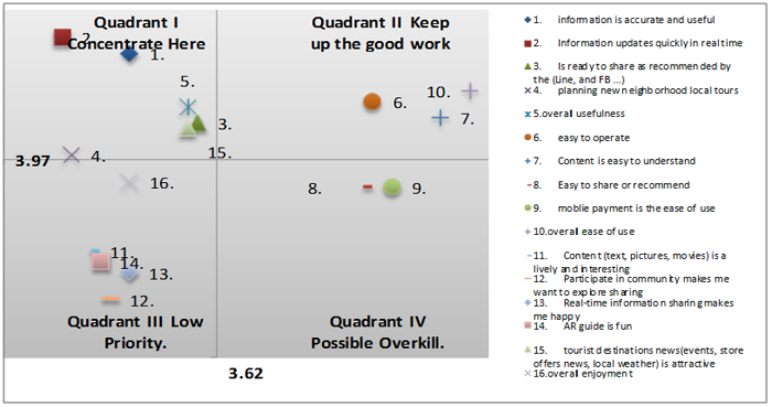 Quadrant III (Low Importance/Low Performance): Thus, any of the attributes that fall into this quadrant are not important and pose no threat to the organizations: Content (text, pictures, movies) is a lively and interesting, Participate in community makes me want to explore sharing, Real-time information sharing makes me happy, AR guide is fun ,overall enjoyment(enjoyment)
