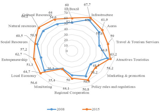 Most of the countries in the South American region rely on rich natural resources and good hospitality (tourist service infrastructure) to appeal to tourists, and they tend to be internationally open. Yet some shared difficulties remain. The ground infrastructure is, with few exceptions, underdeveloped, and cultural resources are not as valued as they could be and it is not different in Brazil. The Graphic 1 shows the last results to Brazil case.