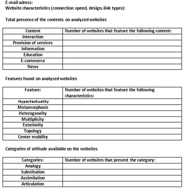 It was found that the faster the connection, the easier the user is able to move through the website; and that the simpler the architecture of the website, with harmonious colors and images, and without effects that disturb the user's attention the more visual comfort users experienced; and that the clearer the nomenclature of the links, the easier it is for users to navigate. The three elements of the analysis were set out in the form in Figure 1.