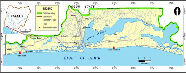 It was this resort that marked the beginning of tourism in the area, to generate more revenue for the local government and employment for residents in and the town surrounding communities, such as the two villages, Fanuvi and Sakpo, which are about 20 miles toward the border with the Benin Republic. Accessed from the Lagos–Badagry Expressway, the beach can accommodate over 5,000 tourists during peak periods—public holidays and festivals. In addition to a chalet for tourists staying overnight, there are sixty straw or asbestos huts available for visitors to rent, while activities such as horse riding, swimming, and photography are available, as well as souvenirs, including raffia hats, bags, purses, and beads. Just outside the resort, there are a minibar, restaurants, spacious car park, and standard performance stage, as well as a police station to ensure maximum security for tourists. Figure 3 is a map of showing the location of the study areas.
