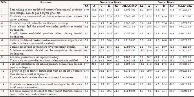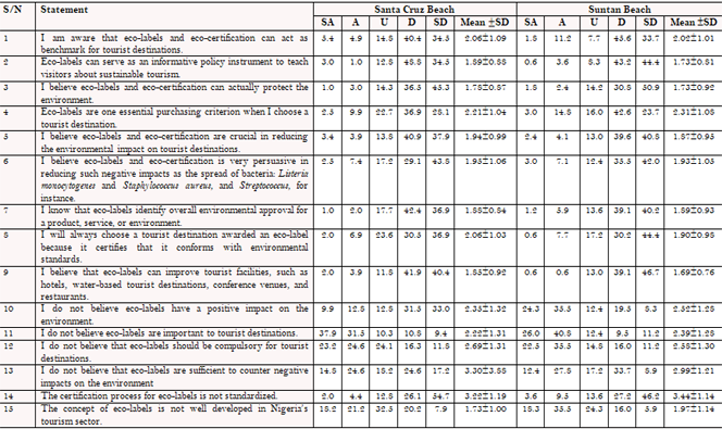 Meanwhile, tourists’ knowledge and appreciation of eco-labels and eco-certification was below average at both Santa Cruz (49.8%) and Suntan Beaches (47.3%), possibly as a result of their lack of popularity in the Nigerian tourism sector. However, with tourists calling for the concept to be put into practice, their environmental awareness seems to be growing. As a result of eco-labels and eco-certification becoming better known, Bastič and Gojčič (2012) explained that many tourists now consider eco-labels as a reliable means of choosing environmentally friendly products and services, while Aliraja and Rughooputh (2004) described how tourists prefer destinations and organizations that protect and conserve the environment and have been awarded eco-labels.
