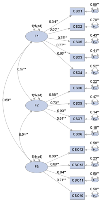 In this study, factor structure was established through exploratory factor analysis, and confirmatory factor analysis was performed in order to verify the factor structure of the tested organizational cynicism scale. The PROC CALIS procedure of SAS 9.4 package program was used to test the factor structure of the organizational cynicism scale whose original factor structure consisted of three sub-dimensions and 13 items (five-item cognitive dimension, four-item affective dimension and four-item behavioural dimension). The data collected from 192 participants were used for the confirmatory factor analysis of the organizational cynicism scale, which was 5-point Likert type. The path diagram obtained as a result of the confirmatory factor analysis is presented together with factor loadings in Figure 1 (F1 = Cognitive, F2 = Affective, F3 = Behavioural).