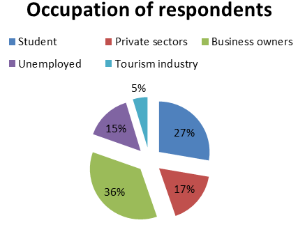Occupational distribution of respondents Figure 3 revealed that 52 respondents which represent 27% were student, 32 respondents representing 17% were private sectors, 67 respondents representing 36% were business owners, while 28 respondents representing 15% were unemployed, with tourism industry having 9 respondents with a percentage of 5%.