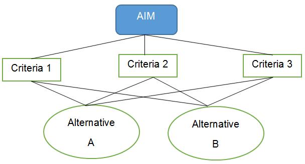 Firstly, in order to “reduce the complexity”, decision factors are structured in a hierarchical manner. The primary aim is sat atop the hierarchy, while the criteria, sub-criteria and decision criteria structure the hierarchical decision problem (Shapira & Goldenberg, 2005). The hierarchical structure concerning the problem is a more organized form of a web. It resembles an upside-down tree. In Figure 2, a general hierarchical structure is illustrated. The root of the hierarchy is the aim or objective of the problem which is being studies and investigated. The knots are the alternatives which are to be compared. Between these two levels, various criteria and sub-criteria can be found (Bhushan & Rai, 2004).
