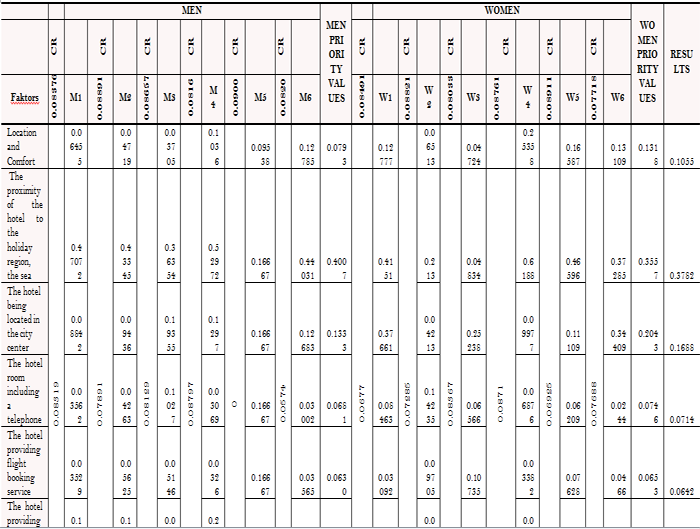 The characteristic which distinguishes this study from prior studies on the measurement of hotel selection factors is that the analysis utilizes the AHP method. The literature review has shown that a large number of studies have been conducted on the factors which affect hotel selection. However, no studies which analyze the selection factors with AHP have come to our attention. The constraints of consumer-based approaches can be that they overlook important aspects of businesses and rest on indexes which are not objective. These can complicate the efforts for measurement. On the other hand, with the AHP method of determining the importance levels of consumer-based selection factors, a paired comparison of each factor can be conducted and presented in quantitative terms from a consumer perspective (Battistoni, Colladon, & Mercorelli, 2013). Another importance of this study is that it attempts to provide the most widely internationally accepted and applicable hotel selection factors within the scope of the literature review to the researchers and hotel managers. In this regard, a wide range of hotel selection factors being specifically linked to the selection of hotels for vacations is one other aspect which distinguishes this study from others. Furthermore, the variation of the selection factors both with the variable of gender and without are investigated in the study. With such above mentioned aspects, this research can contribute to the existing literature.