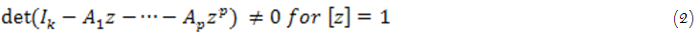 Stability is an important characteristic of the VAR model, which generates stationary time series with time-invariant means, variances, and covariance structure, given sufficient starting values. This characteristic can be checked in Equation 2 with the following equation: