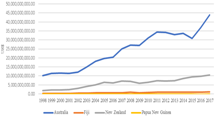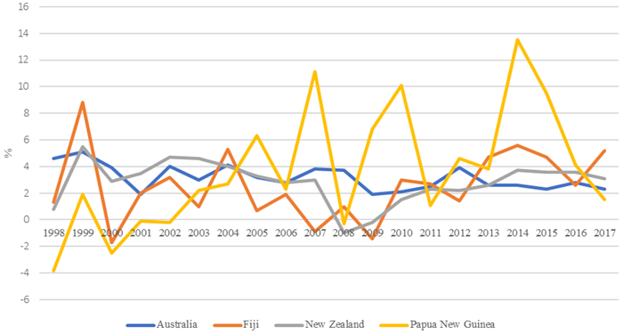 Figure 3 shows the rate of annual GDP growth of four countries which fluctuated between 1998 and 2017. From 2013 to 2017, annual GDP growth rate was dominated by Papua New Guinea, followed by Fiji, New Zealand, and Australia. By 2017, annual GDP growth rate of Fiji accounted for 5.2 percent, followed by New Zealand (3.1 percent), Australia (2.3 percent), and Papua New Guinea (1.5 percent).