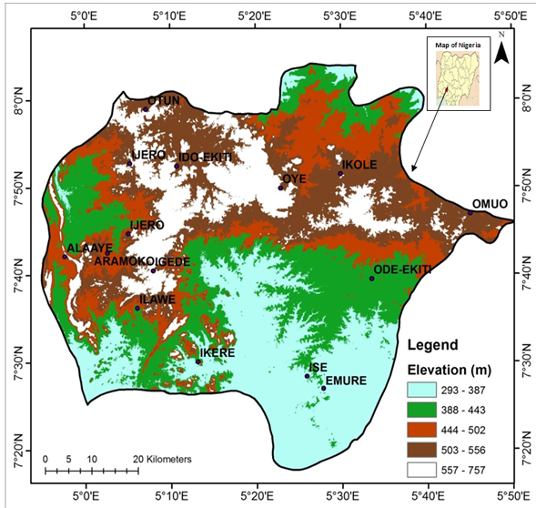 The study on developing cluster for mountains and hills was conducted in Ekiti State, Southwest Nigeria. It was carried out in some selected communities with mountains and hills; Ado Ekiti, Ilokun, (Ado Local Government Area), Efon Alaaye, Obake, Orisumibare, and Oba Ayetoro (Efon Local Government Area), Ijero and Epe (Ijero Local Government Area), Aramoko, Erio, and Okeimesi (Ekiti West Local Government Area), Iyin, Iworoko, Igede (Ifelodun/Irepodun Local Government Area), Igbole Ekiti (Ido/Osi Local Government Area) Abaoke-Ilabo (Ikole Local Government Area), Ewu (Ilejemeje Local Government Area) Ilupeju and Apata-Aje (Oye Local Government Area), Ilawe and Igbara-Odo, Ikogosi, Ipole-Iloro (Ekiti Southwest Local Government Area), Ikere Ekiti, Atoka, Oke Aso, and Okejegbende (Ikere Local Government Area). Figure 1 Ekiti State is located between longitudes 40 0 51I and 500 451I East of the Greenwich meridian and latitudes 70 0 151 and 800 51I North of the Equator. It lies south of Kwara and Kogi State, East of Osun State and bounded by Ondo State in the East and in the South. The land Area is 5,887.890sq km. The size, latitudes and longitudes of the selected towns and communities in Ekiti State for this study are in Table 1. The land of Ekiti is known for its forest resources, notably timber. However, because of favourable climatic conditions, the land enjoys luxuriant vegetation. The flora composition in Ekiti State includes trees species such as Acacia albida Delile (Mimosaceae), Albizia fernginea (Mimosaceae), Alstonia boonei De wild (Apocynaceae), Berlinia coriacea Keay (Caesalpiniaceae), Antiaris toxicaria Lesch (Moraceae), celtris zenkeri Engl (Ulmaceae), Melicia exlcesa (Welw) Benth (Moraceae), Khaya grandifoliola C.DC. (Meliaceae), etc.Also, animal species such as grass-cutter (Thyronomys swinderianus), Maxwell duiker (Cephalophus maxwelli), Bush pig (Potamochoerus porcus), ground squirrel (Protoxerus stranger), African giant rat (Cricetomys gambianus), Bush buck (Tragelaphus scriptus), etc. are predominant in the area. The State enjoys tropical climate with two distinct seasons. These are the rainy season (April–October) and the dry season (November–March). The annual rainfall values in Ekiti in the last 20 years ranges between 996.4mm minimum to 1549.4mm maximum (Owolabi, 2019). Temperature ranges between 21° and 28 °C with high humidity which ranges between 65 – 100% during the dry and wet season respectively. The south westerly wind and the northeast trade winds blow in the rainy and dry (Harmattan) seasons respectively. The occupation of indigenes of Ekiti State is predominantly farming because the land enjoys favourable climatic conditions with luxuriant vegetation, where food crops such yam, cocoyam, cassava, rice, and maize are grown in large quantities. There are other notable crops like Cocoa and Kolanut, while and other varieties of fruits such oranges, pineapples, cashew, Plantain, Bananas etc. are cultivated in commercial quantities. As a matter of fact, Ekiti people are culturally homogeneous and speak a dialect of Yoruba language known as Ekiti. This homogeneous nature confers on the state some uniqueness among the states of the federation. Ekiti State is generally an undulating part of the country with a characteristic landscape that consists of old plains broken by step-sided out-crops that may occur singularly or in groups or ridges. Such rocks out-crops exist mainly at Aramoko, Efon-Alaiye, Ikere Ekiti, Igbara-odo ekiti, and Okemesi Ekiti. The State is dotted with rugged hills, notable ones being Ikere-Ekiti Hills in the south, Efon-Alaiye Hills on the western boundary and Ado-Ekiti Hills in the centre. Many hills in Ado Ekiti are Ekiti Hills located along Iyin road. Also, Okuta gbokuta lori hills (Hill carries hill) Olota hills are domiciled in Ado-Ekiti. Generally, Ekiti land is naturally endowed with numerous natural resources such as Granite, Kaolin, Columbite, Channockete, Iron ore, Baryte, Aquamine, Gemstone, Phosphate, Limestone, Gold among others. These are largely deposited in different towns and villages of Ijero, Ekiti west, Ado-Ekiti, Ikole Ekiti, Ikere, Ise-Ekiti, Okeimesi, Aramoko, Igbara-Odo, Erio, and Osi Ekiti.