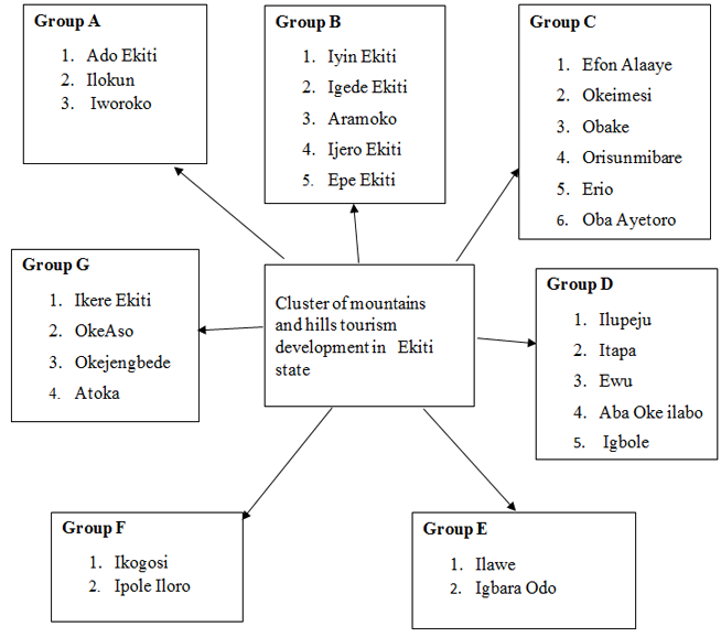 The study was done to develop cluster for mountains and hills tourism in Ekiti State. It was carried out to gain an insight into the various mountains and hills domiciled in some selected communities of the State and how these could be grouped together for development and easy accessibility to potential visitors and tourists to Ekiti State. The government of Ekiti is fully aware that the State is dotted with potential of mountains and hills that could be used for tourism development in Ekiti State. And, that some of them have amiable features such as spring water, water falls, beautiful vegetation and topography, serene environment, cool temperature that can attract tourists to the State.