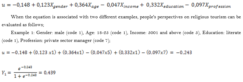 The equation shows the category to which the individual belongs in the dependent variable, which is perspectives on religious tourism, in other words, the probability of being in one of the categories of being a believer or unbeliever. And u is the line regression equation.