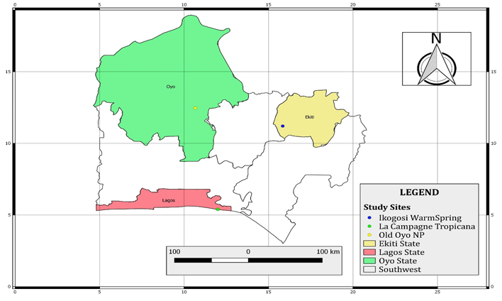 This study was carried out at Old Oyo National Park managed by the Federal Government of Nigeria located within coordinates 7.8501710N and 3.9114650E, Ikogosi Warm Spring managed by Ekiti State government located within coordinates 7.5908040N and 4.9800590E and Lacampagne Tropicana managed privately located within coordinates 6.39260 N and 4.18650 E (see Figure 1). The target population for this study were tourists of the sites and Krejcie and Morgan (1970) determination of sample size was used to proportionately select the twenty visitors at Old Oyo National Park, one hundred and fifty tourists at Ikogosi Warm Spring Resort and two hundred and fourteen tourists at Lacampagne Tropicana making a total of three hundred and eighty-four tourists. This study made use of relevant literatures to construct questions in the questionnaire. Data was obtained across the three sites from January to June, 2021. Data was collated and analyzed using Statistical Package for Social Science version 23 and results were presented descriptively using frequency, percentage and tables. Inferentially, Analysis of Variance (One-Way ANOVA) was used to test the significant difference in socio-demographic characteristics of tourists in the sites as well as their perception on the usage of information Communication Technology at the sites.