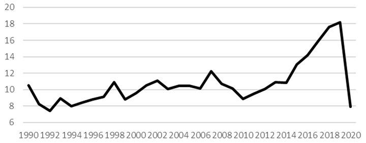 Between 1990 and 2020, the number of museums in Romania increased by 69.6% from 450 units in 1990 to 763 units in 2020 (see Figure 1). Despite this, moments of decline include in 1992 when the number of museums fell by 4.9% compared to 1990. In 2010, the number of museums also fell by 1% compared to 2009. 2012 marked the sharpest decrease of 6.5% compared to 2011, from 709 units to 663. In 2014, the fall was 1.5% compared to 2013, and in 2020, the fall was 3.5% compared to 2019.Between 1990 and 2019, the number of visitors to museums and public exhibits in Romania increased by 73.1%, from 10.5 million people in 1990 to 18.2 million in 2019 (see Figure 2). There were decreases in the number of visitors in 1991, 1992, 1994, 1999, 2003, 2006, 2010, and 2014. The most significant reduction was in 2020, amid restrictions triggered by the COVID-19 pandemic.
