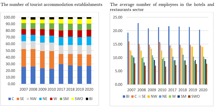 The evolution of employment in the tourism industry from 2007 to 2020 (share of total value by region) was as follows: in 2010, the share was reduced in the North-West, North-East, South-Muntenia, South-West Oltenia, and West regions. In 2020, there was a reduction in the share in the North-West, Centre, North-East, and Bucharest-Ilfov regions. On the other hand, the average number of employees increased in the Centre, South-East, and Bucharest-Ilfov regions in 2010 and in the South-East, South, South-West Oltenia, and West regions in 2020. Therefore, the most important share was recorded in the Bucharest-Ilfov region, followed by the Centre and South-East regions.