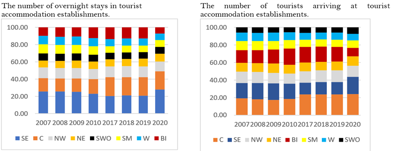 If we consider tourism demand, two statistical dimensions are significant for our research approach – the overnights spent and the total number of tourists who used the infrastructure. Figure 4 shows the evolution of nights spent per region (share of total value per region). In 2010, the share was reduced in North-West, North-East, South-East, South-West Oltenia, and West. In 2020, there was a reduction in the share in the North-West, Centre, South-Muntenia, Bucharest-Ilfov, and West regions. The regions with a decline in the value of this indicator in both periods were North-West and West. On the other hand, the number of nights spent increased in the Centre, South-Muntenia, and Bucharest-Ilfov regions in 2010 and in the North-East, South-East, and South-West Oltenia regions in 2020. The most significant shares were in the South-East region, followed by the Centre and North-West regions.