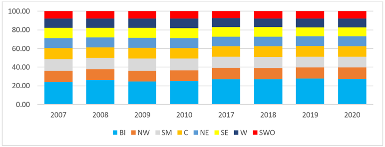 Figure 4. Romania’s tourism demand, distribution by regions, 2007–2020 (% of regions in total).