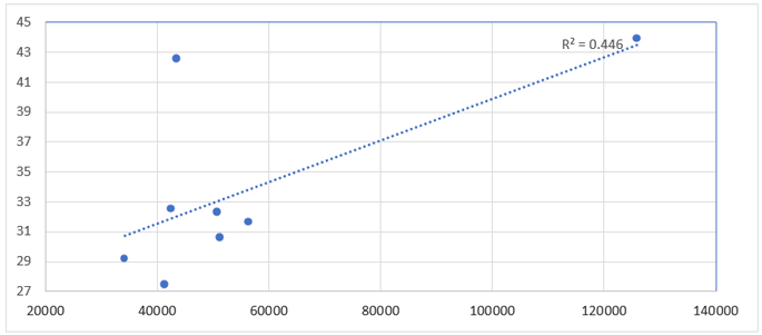Figure 7. Occupancy rate (%) and regional GDP per capita (national currency, lei), 2019.
