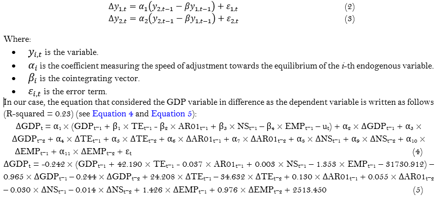 Series: GDP TE AR01 NS EMP, Sample 1993 2020, Included observations: 224, Lags interval (in first differences): 1 1, Unrestricted Cointegration Rank Test (Trace and Maximum Eigenvalue)