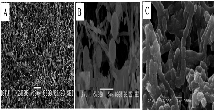The most active actinomycete isolate was characterized according to morphological, physiological and biochemical characteristics [15]. Microscopic examination was performed using light microscope (Optika, Italy) through cover slip technique [16] and scanning electron microscopy (SEM) (JEOL Technics Ltd, Japan) at the regional center for mycology and biotechnology, Al-Azhar University, Cairo [17] Culture characteristics were screened on different International Streptomyces Project (ISP) media: tryptone yeast glucose agar medium (ISP-1), inorganic salts starch agar (ISP-4), Peptone yeast extract agar (ISP-6), malt extract agar (ISP-2), glycerol asparagine agar (ISP-5), oat meal agar (ISP-3) and Tyrosine agar (ISP-7) after incubation at 28◦C for 10 days. Actinomycete isolate was evaluated for their ability to utilize different carbon and nitrogen sources in ISP-9 media. Salt tolerance was examined on starch nitrate medium at different concentrations of NaCl; 0, 1, 2, 3, …… 10% (w/v). pH and temperature ranges were studied on starch nitrate medium [18]. Tolerance to toxic materials was performed including Sodium azide 0.01 & 0.02% (w/v), Phenol 0.1%(w/v), Crystal violet 0.001%(w/v) and growth on czapekʼs medium according to Atta, et al. [19]. Biochemical parameters including catalase, citrase, oxidase, lipase, caseinase, gelatinase, lecithinase, urease production, cellulose decomposition of tyrosine and pectin, H2S production were performed [20]. The identification scheme of actinomycete isolate was followed according to Bergey’s Manual of Determinative Bacteriology [21]. Molecular identification was done using 16S rDNA analysi [19].